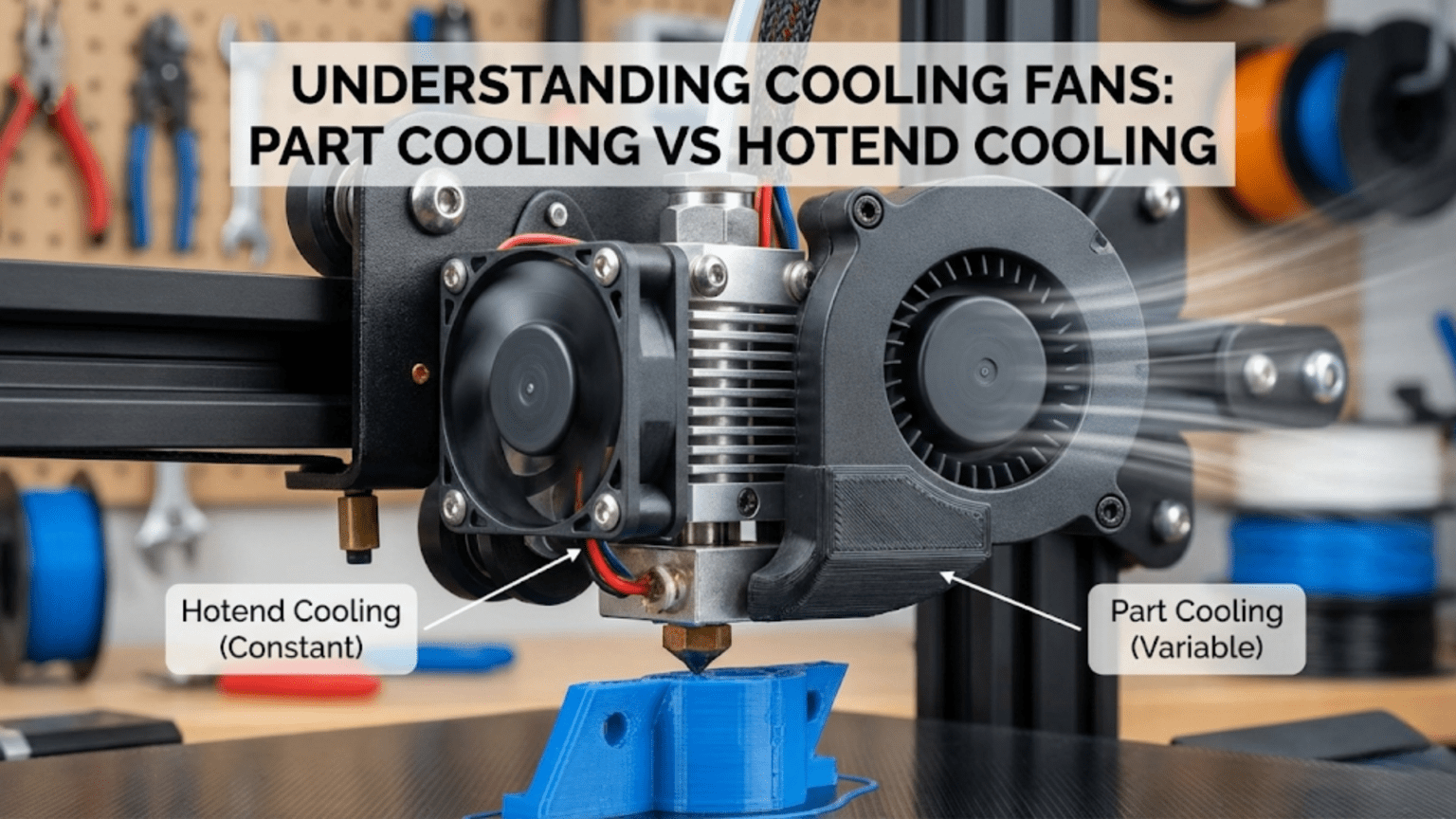 3D printers use two distinct cooling systems serving different purposes: the hotend cooling fan runs continuously at full speed to cool the heat sink and prevent heat creep from softening filament prematurely in the cold zone, while the part cooling fan blows variable-speed air onto freshly extruded plastic to rapidly solidify it, improving overhangs, bridges, and fine details. Both fans are essential but serve opposite functions—one keeps specific areas hot while the other cools the printed part.