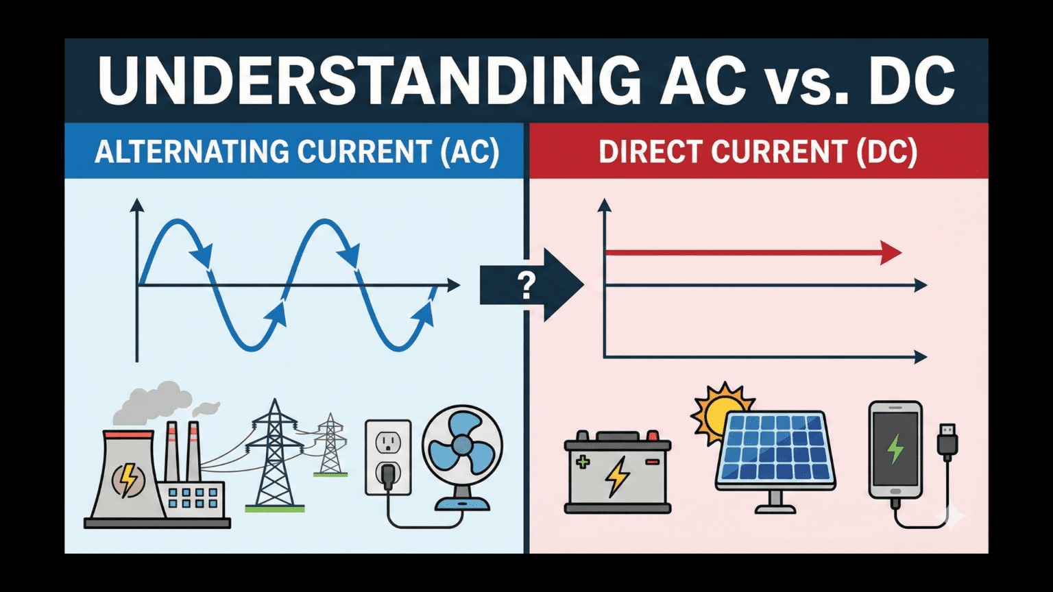 Every electrical device you use operates on one of two fundamentally different types of electrical current: direct current (DC) or alternating current (AC). Your smartphone battery provides DC. The wall outlet in your home supplies AC. A solar panel generates DC. The power grid delivers AC. This distinction between AC and DC represents one of the most important concepts in understanding how electrical systems work, yet many people use electricity daily without understanding what makes these two types of current different or why both exist.