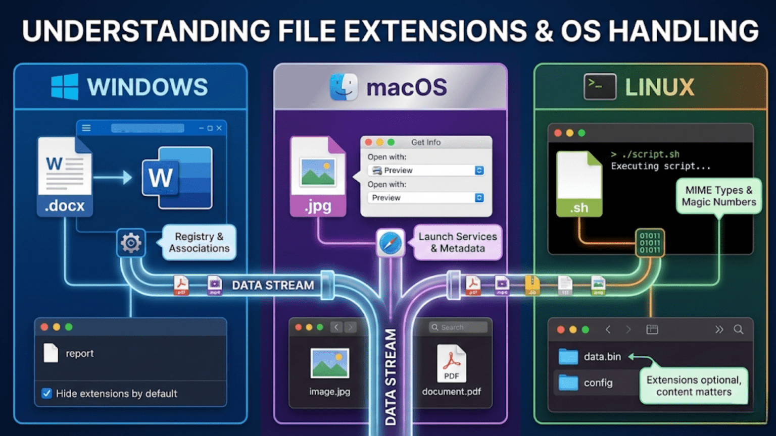 File extensions serve as one of the primary methods operating systems use to classify files, but the extent to which different operating systems depend on these extensions varies dramatically. Windows treats file extensions as critical identifiers that determine file behavior, macOS takes a hybrid approach that considers extensions alongside other file metadata, and Linux generally treats extensions as optional conventions rather than requirements. These different approaches reflect broader philosophies about how computers should interact with users and how much the system should infer from filenames versus file contents. This comprehensive guide explores what file extensions are, how they function at both user and system levels, how different operating systems implement extension handling, and the practical implications these differences have for your daily computing experience.